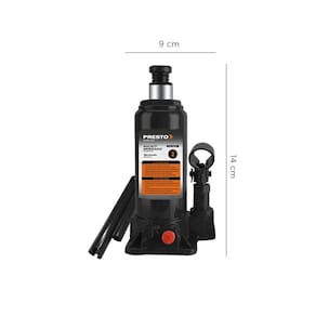 Macaco Hidráulico Tipo Garrafa de 2 Toneladas (2000 kg) PRESTO, elevação manual, é ideal para levantar veículos com segurança e eficiência. Compacto e robusto, é essencial em oficinas, borracharias e garagens.