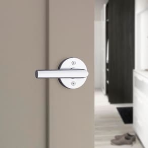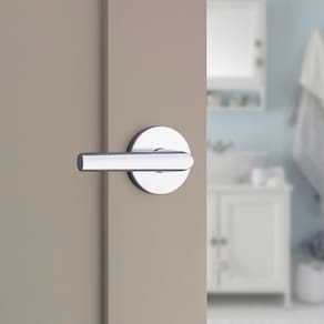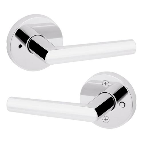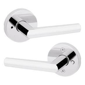 Kwikset Maçaneta de porta de privacidade interior Milan com fechadura, maçaneta de porta para banheiro e quarto, maçaneta de porta reversível cromada polida com botão de pressão sem chave