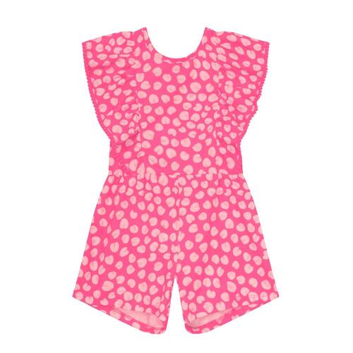 Este macaquinho infantil feminino, confeccionado em malha, é a escolha perfeita para as pequenas fashionistas neste verão. Com estampa rotativa animal print, que está em alta na moda, ele garante um visual moderno e estiloso. O recorte na cintura define a silhueta, enquanto os recortes com pregas nas mangas formam delicados babados, complementados por um charmoso barrado com pompons. Uma peça cheia de personalidade e conforto para momentos de diversão ao sol.