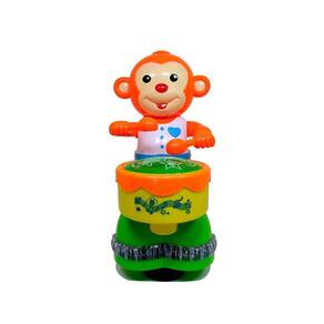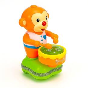 O macaquinho bate no tambor de forma rítmica, introduzindo o bebê ao universo da música.