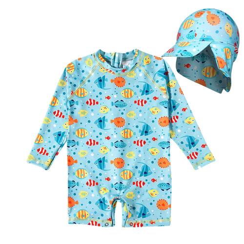 Macaquinho Praia Infantil com Boné Proteção UV 50+ Estampas Tip Top - Azul Claro - 6 A 9 meses