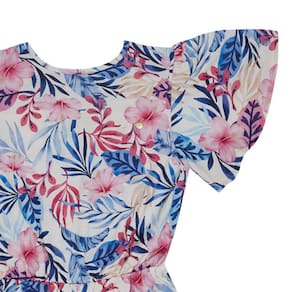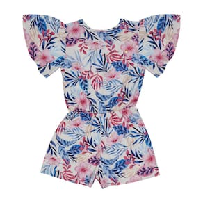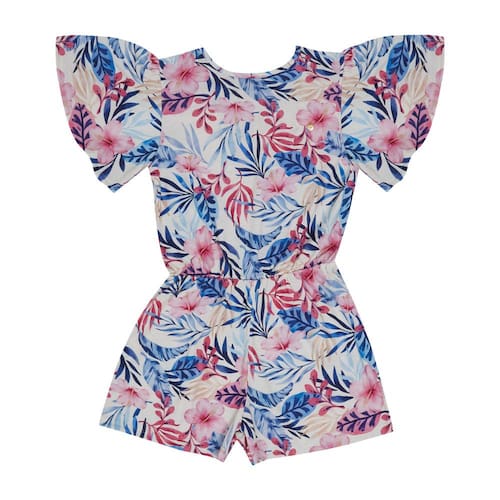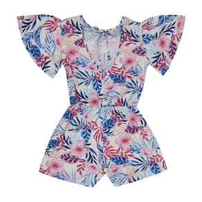 Versátil e rápido, lookinhos com macacão são apostas certeiras para as fashionistas irem brincar com a amiguinha no parquinho. Confeccionado em malha leve, o macaquinho na cor azul possuí estampa sublimada de flores e folhas tropicais. O conforto, liberdade e leveza em uma peça! \n