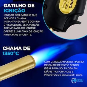 O maçarico portátil HIATSU JH-1ST oferece ignição rápida e segura com acionamento por gatilho, permitindo acender a chama instantaneamente com um único clique. Seu ignitor aprimorado melhora a taxa de ignição, garantindo uma performance confiável. Compatível com gás Propano, MAPP e MAP-PRO, o modelo conta com um botão ajustável que possibilita controlar o tamanho da chama conforme a necessidade. A válvula reguladora em latão sólido garante maior resistência e durabilidade.
