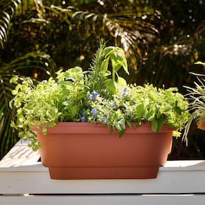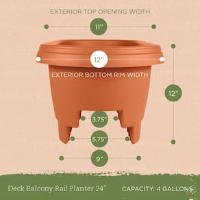 Macetero Bloem Deck para barandilla de balcón: 24" - Terracota. Capacidad: Acepta 15 litros de plantas y tierra. Construcción duradera: Fabricado con resina protegida contra rayos UV para resistencia al desvanecimiento. Resistente a la intemperie: Se adapta a barandillas de 8,25 cm a 9,5 cm de ancho y 13,35 cm a 14,6 cm de alto. Mantenimiento sencillo: No se requieren herramientas para el ensamblaje o limpieza. Hecho en EE.UU.: Orgullosamente fabricado localmente.