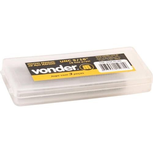 Conteúdo da embalagem1 Jogo de macho manual com 3 peçasAplicações e dicas de usoIndicado para fazer roscas internas. Utilizado com vira macho não acompanha . Para aumentar sua vida útil, recomenda-se utilizar fluído/óleo de corte para lubrificação e resfriamento.Destaques e diferenciaisProduzido em aço rápido, proporcionando maior resistência e durabilidade DETALHES TÉCNICOS Material do macho: Aço rápido Diâmetro da rosca do macho pol : 1/4 Tipo da rosca do macho: UNC - Polegada rosca grossa Número de fios por polegada:20 Número de peças do jogo de macho: 3 peças Composição do jogo de macho: 1º, 2º e 3º macho Norma DIN:351