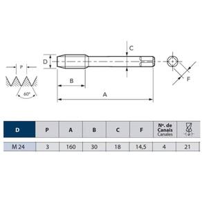Possui canal helicoidal e rosca métrica grossa. Indicado para furo cego em material de cavaco longo. Usinagem de aço teor de carbono, ferro fundido dúctil, liga de alumínio fundido, cobre, latão, bronze, alumínio laminado, etc. Medida Rosca: M24 Passo Rosca: 3mm Furo da Broca: 21mm Comprimento Total: 160mm Comprimento Corte: 30mm Diâmetro Haste: 18mm Diâmetro do quadrado: 14,5mm Material: HSS-E Tipo Canal: Canal Helicoidal Direção Corte: Direito Modelo: M24 Marca: Osg SKU: 52420