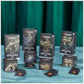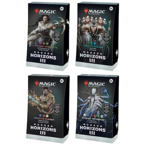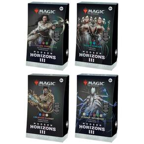 Este pacote contém os 4 decks de comandante do Modern Horizons 3 Graveyard Overdrive, Tricky Terrain, Creative Energy e Eldrazi Incursion. Cada baralho é composto por 100 cartas de Magic, incluindo 2 cartas lendárias foil tradicionais e um pacote de amostra de colecionador com 2 cartas, sendo uma delas rara ou mítica rara e pelo menos uma carta foil tradicional. Além disso, cada deck acompanha uma cópia grossa em cartolina da carta de comandante com folha gravada na borda e na arte das cartas, 10 fichas de dupla face, 1 caixa de baralho para até 100 cartas com protetores, 1 roda da vida, 1 encarte de estratégia e 1 carta de referência.