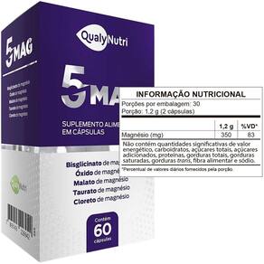 O que é o 5mag, qualynutri O 5mag, qualynutri é um suplemento alimentar que contém uma fonte poderosa de magnésio, com 5 tipos diferentes desse mineral essencial para o bom funcionamento do corpo. Formulado em cápsulas, o 5mag oferece uma maneira prática de complementar a alimentação, promovendo diversos benefícios à saúde. Composição do 5mag: Este suplemento contém cinco formas diferentes de magnésio, permitindo uma absorção eficiente e atuando em várias funções do organismo. O magnésio é fundamental para a formação óssea, o funcionamento muscular e o metabolismo energético. Para que serve o 5mag O 5mag é indicado para complementar a ingestão diária de magnésio, contribuindo para a saúde óssea, o bom funcionamento muscular e o equilíbrio do metabolismo energético. É ideal para quem busca um suplemento que auxilie na prevenção de deficiências desse mineral essencial, especialmente em pessoas com maior demanda de magnésio. Benefícios do 5mag: Auxilia na formação óssea e no fortalecimento dos ossos; Contribui para o funcionamento adequado dos músculos; Melhora o metabolismo energético, promovendo mais disposição; Formulado com cinco tipos de magnésio para melhor absorção e eficácia; Produto sem glúten. Como devo usar o 5mag Recomenda-se ingerir 2 cápsulas por dia, junto das principais refeições ou conforme orientação do profissional de saúde responsável. Advertências: Este produto é recomendado para uso adulto; Em caso de dúvida, consulte um médico ou nutricionista antes de iniciar o uso; Mantenha o produto em local fresco e seco, longe da luz e umidade; Este produto não contém glúten, sendo seguro para pessoas com restrições alimentares. este produto não é um . não exceder a recomendação diária de consumo indicada na embalagem. mantenha fora do alcance de crianças. Marca: Não Informado