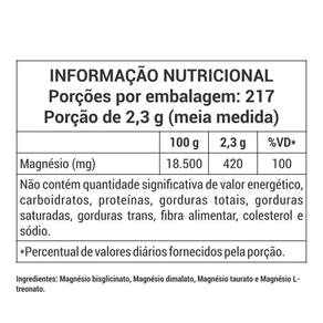 Informação nutricional: Porções por embalagem: 217 porções Porção de 2,3 g meia medida - quantidade de magnésio por porção: 420 mg 100% idr Não contém quantidade significativa de valor energético, proteínas, carboidratos, gorduras totais, gorduras saturadas, gorduras trans, fibra alimentar e sódio.