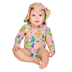 O Maiô para bebê Safari com proteção UV 50+ possui chapéu coordenado e é perfeito para as bebês. Em manga longa conta com estampa de simpáticos bichinhos e folhagens em tons de verde neon! Confortável, prático e seguro, ele é ideal para dias ensolarados na praia ou piscina, garantindo estilo e proteção para as pequenas. Possui botões entrepernas para facilitar a troca de fraldas e o vestir.