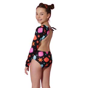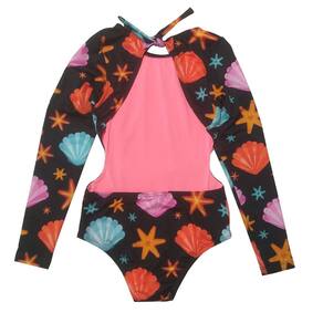 O Maiô Infantil Manga Longa para meninas com estampa de conchas Preto possui mangas longas para maior proteção e as brincadeiras na praia e piscina serem só diversão sem preocupação. O modelo é aberto nas costas e dos lados, e amarração na nuca.