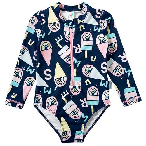 O Body Praia infantil Sorvetes Marinho da Tip Top é ideal para o dia a dia na praia ou na piscina. Seu tecido é suave e confortável, e seu design moderno e divertido é perfeito para as meninas. Além disso, possui proteção UV, 50+ permanente que ajuda a manter a pele das pequenas segura durante todas as brincadeiras ao sol. O fechamento frontal com zíper, torna a peça ainda mais prática e bonita.