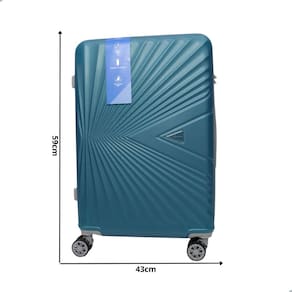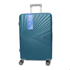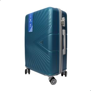 Mala de viagem injetada em material rígido de ABS, rodas que giram 360°, alça de mão retrátil, cadeado com segredo, compartimento interno com fechamento em zíper e duas tiras para prender roupas.