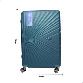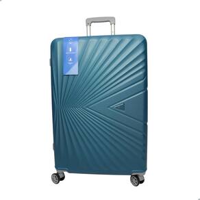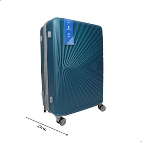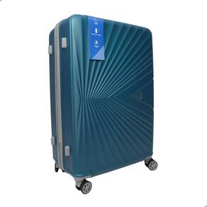 Mala de viagem injetada em material rígido de ABS, rodas que giram 360°, alça de mão retrátil, cadeado com segredo, compartimento interno com fechamento em zíper e duas tiras para prender roupas.