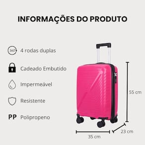 Fabricada em polipropileno resistente, a mala garante durabilidade e proteção contra impactos.