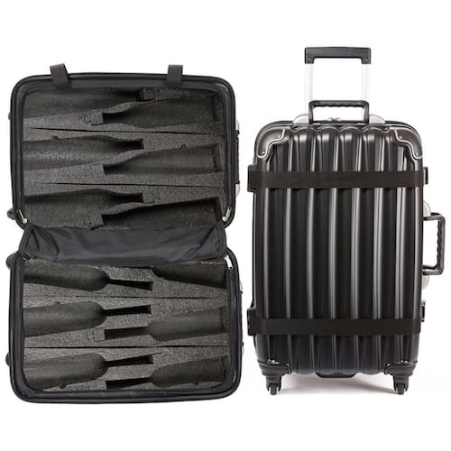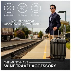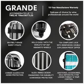 Comporta até 12 garrafas 750ml de vinho ou destilados. Projetado para acomodar roupas ou outros itens pessoais, removendo uma ou mais inserções. Inserções adicionais para magnum e destilados disponíveis. Peso vazio 6 kg. Dimensões 68 x 44 x . Com base em garrafas de vinho de 1.4 kg médias, pesa menos de 50 libras totalmente embaladas. Caixa de material composto 100 proprietária com inserções de espuma de alta densidade. design com nervuras, barra de reforço e proteções de canto reforçadas para um desempenho ainda mais forte. Fechadura integrada em conformidade com TSA montada na parte superior. Zíper de canal duplo reforçado redesenhado. Cintos de segurança de , cintas de ruptura de poliéster. Rodas Hinomoto de 360 graus Marca: Não Informado