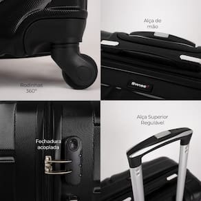 Fabricada em ABS, esta mala é resistente e durável, equipada com 4 rodas 360 que proporcionam fácil manobrabilidade. Possui cadeado fixo com senha para segurança, carrinho com ajuste de altura para maior conforto e alça de mão. No interior, conta com cinta elástica e divisória em zíper para manter tudo organizado. Além disso, a mala pequena é aprovada pela Agência Nacional de Aviação Civil (ANAC) para ir à bordo, tornando-a a escolha perfeita para suas viagens.