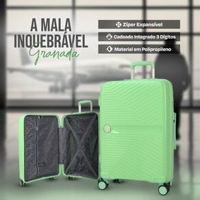 Características: Material: Polipropileno Alça de mão superior e alça retrátil de alumínio Cadeado com combinação numérica 4 rodas duplas com giro 360 graus Bolso interno com fechamento em zíper