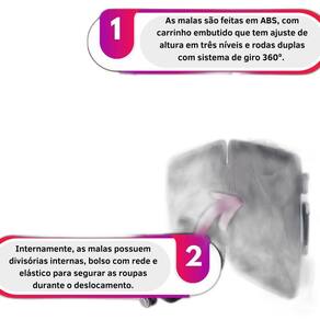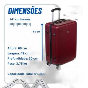 Marca: Sestini Tamanho: Médio Material: ABS Alça: De Mão Peso: 3,75 kg Capacidade Total: 61,36 L O que você recebe neste compra: 01 Mala Bordo 360 Dimensões: Altura: 69 cm x Largura: 42 cm x Profundidade: 30 cm. - Dia a Dia - Viagem - Trabalho - Férias - Todos os tamanhos possuem cadeado fixo de três dígitos, trazendo mais segurança para seus pertences. Internamente, as malas possuem divisórias internas, bolso com rede e elástico para segurar as roupas durante o deslocamento. de 3 meses contra problema de fabricação. As cores das imagens exibidas podem sofrer variações dependendo da tela em que são visualizadas.