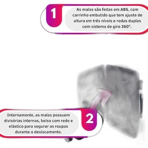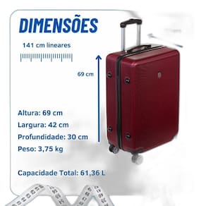Marca: Sestini Tamanho: Médio Material: ABS Alça: De Mão Peso: 3,75 kg Capacidade Total: 61,36 L O que você recebe neste compra: 01 Mala Bordo 360 Dimensões: Altura: 69 cm x Largura: 42 cm x Profundidade: 30 cm. - Dia a Dia - Viagem - Trabalho - Férias - Todos os tamanhos possuem cadeado fixo de três dígitos, trazendo mais segurança para seus pertences. Internamente, as malas possuem divisórias internas, bolso com rede e elástico para segurar as roupas durante o deslocamento. de 3 meses contra problema de fabricação. As cores das imagens exibidas podem sofrer variações dependendo da tela em que são visualizadas. Marca: Não Informado