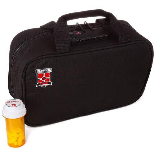 Logotipo da bolsa de viagem Medicine RX Safe Medicine — Tranquilidade: medicamentos e certos produtos de higiene pessoal podem ser prejudiciais para crianças pequenas e bebês e precisam ser protegidos. Durante as férias ou visitando amigos e familiares, os pais geralmente precisam de uma proteção extra enquanto estão fora de casa. A bolsa de viagem para medicamentos resolve esse problema fornecendo um espaço com chave para esses itens potencialmente perigosos. - Fechadura combinada de 3 dígitos, aprovada pela TSA: medicamentos, produtos de higiene pessoal e itens pessoais são protegidos por uma trava combinada na parte superior da bolsa. Essa fechadura é aprovada pela TSA e facilita as viagens pela segurança do aeroporto. Os zíperes de metal da bolsa se encaixam na própria fechadura para uso fácil e seguro. As combinações são fáceis de configurar e podem ser alteradas se necessário. - Fácil de embalar: semelhante a uma bolsa de higiene padrão, a bolsa de viagem para medicamentos pode ser embalada dentro de praticamente qualquer mala, mochila, bolsa de bebê ou bolsa de fraldas, o que é um acessório fácil de transportar. - Construção robusta: construída pensando na qualidade, a bolsa de viagem para medicamentos foi projetada para suportar as demandas de viagens. Seu tecido externo de náilon e a tubulação ao redor da borda evitam rasgos e desgaste. - Função versátil: capaz de proteger medicamentos, produtos de higiene pessoal e itens pessoais, a bolsa de viagem para medicamentos é realmente um acessório de viagem multiuso. Embora seja ideal para pais e avós, esta mala de viagem pode ser usada por praticamente qualquer pessoa que queira um pouco mais de tranquilidade durante a viagem.