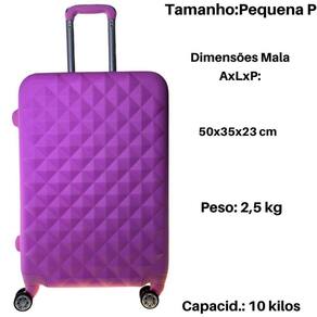 Viaje para qualquer destino com a segurança e o conforto da Mala de Viagem de bordo tamanho P da Parana.Com design sofisticado e moderno, dessa mala de viagem, sendo a melhor opção para você levar seus pertences bem acomodados e seguros.Isso porque a mala é rígida, pois é confeccionada em ABS, o que garante uma estrutura forte e resistente. Além disso, possui 4 rodas giratórias em 360, carrinho embutido regulável, alça superior e fechadura segura.E tem mais: a Mala tem o interior totalmente forrado em poliéster, cinta elástica cruzada com trava e bolso interno, ideal para acomodar suas roupas de forma que evite bagunça.Para uma viagem tranquila e organizada, clique em comprar e ganhe 3 meses de garantia pelo fabricanteCaracterística da Mala de viagem Material: ABS4 rodasCarrinho embutido regulávelAlça superiorFechaduraTextura micro diamanteInterno: interior totalmente forrado em poliésterCinta elástica cruzada com travaBolso internoTamanho: Pequena de bordo Dimensões Mala A x L x P: 50x35x23 cm Peso: 2,5 kgCapacidade: 10 kilos