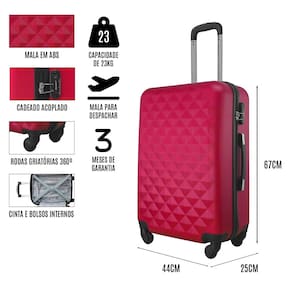 Características - Mala rígida em fibra ABS tamanho média (23kg); - Produto dentro das medidas para mala despachar; - Mala com cadeado de segredo (senha) acoplado; - Forração interna acolchoada;- Alça flexível superior para maior conforto e comodidade; - Bolso interno com zíper;- Rodas giratórias em 360º;- Carrinho retrátil com pintura eletrostática e botão liberador com dois níveis de ajustes.