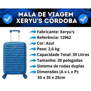 • Fabricante: Xeryu s • Referência: 12962 • Cor: Azul • Tamanho: 20 polegadas • Peso: 2,6 kg • Capacidade Total: 39 Litros • Acompanha etiqueta identificadora. • Fabricada em material resistente de alta qualidade. • Estrutura: Possui uma estrutura robusta para proteção dos pertences durante o transporte. • Compartimentos: Conta com compartimentos internos bem distribuídos para facilitar a organização dos itens pessoais. • Fixação: Correias internas para fixação dos pertences e evitar movimentação durante o transporte. • Sistema de rodas duplas 360° que trabalham em conjunto para te proporcionar um transporte fácil, leve e macio. • Alça retrátil para puxar a mala com facilidade. • Capacidade: Capacidade de armazenamento para viagens curtas ou como bagagem de mão em voos. • Fechamento: Sistema de fechamento em zíper seguro e confiável. • Design: Design elegante e contemporâneo, com acabamento que confere sofisticação. • Dimensões (A x L x P): 55 x 35 x 25cm