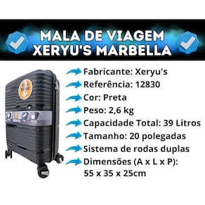 As tendências surgem a todo instante, mas assim como o seu estilo, a MARBELLA XERYUS é autêntica! Feita com estrutura leve e resistente de polipropileno (material firme e flexível), este modelo mantém as cores até mesmo nos detalhes como a haste do carrinho embutido, no cadeado fixo embutido na mala. Na alça de mão lateral e nas rodas duplas que giram 360°. O design interno é amplo e vem com divisória com fecho de zíper e bolso organizador, além de cinta para manter a organização de roupas e pertences durante o deslocamento.