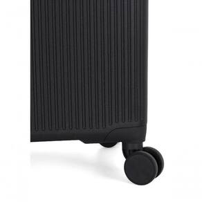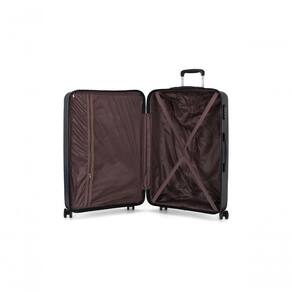 A abertura lateral possui um zíper personalizado da marca, enquanto a mala é fabricada em PP (polipropileno), um material altamente resistente e de fácil manuseio. O design inclui um logo em metal e um acabamento em alto relevo, complementado por um forro em poliéster, divisória interna com elástico, fechamento em zíper e bolso interno com zíper.