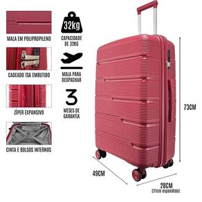 Características:- Mala rígida grande (27") em polipropileno;- Cadeado com segredo embutido;- Forração interna acolchoada;- Alças flexíveis superior e lateral para maior conforto e comodidade;- Bolso interno com zíper;- Rodas duplas giratórias em 360º;- Carrinho retrátil com pintura eletrostática e botão liberador. Medidas (LxAxP):Tamanho G: 49x73x25cm (28cm expandida)Peso: 3,9kg