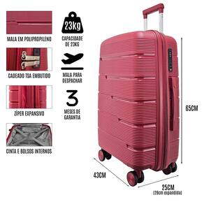 Mala média 23kg em polipropileno com rodas giratórias em 360º, zíper expansor e cadeado TSA Gladiador P2M.Características: - Mala rígida tamanho média em polipropileno - mais durabilidade e segurança para sua viagem; - Cadeado TSA com segredo embutido; - Zíper expansor; - Forração interna acolchoada; - Alças flexíveis superior e lateral para maior conforto e comodidade; - Bolso interno com zíper; - Rodas duplas giratórias em 360º; - Carrinho retrátil com pintura eletrostática e botão liberador.