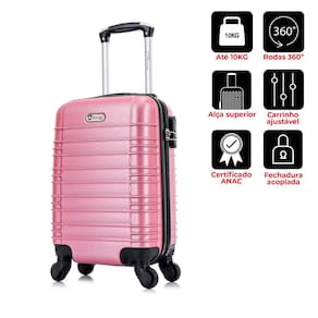 Disponível na cor rose, a mala de bordo pequena possui carrinho em alumínio embutido, o que deixa o produto muito mais leve, rodas plásticas que proporcionam mais facilidade em sua locomoção, cadeado acoplado fixo que garante mais segurança ao seu produto.