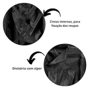 Compartimentos internos: divisórias, elásticos e bolso com zíper, contendo bolso frontal acolchoado para notebook de até 15,6