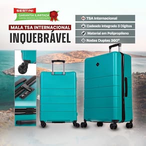 Marca: Sestini Material: Polipropileno Em comparação com o ABS, este material é muito mais resistente e está presente nas malas de qualidade superior Garantia: Vitalícia Sistema Spinner: 4 rodas duplas com giro 360 para fácil mobilidade Carrinho: Retrátil em alumínio com botão liberador Alças: Superior e lateral reforçadas Cadeado: TSA, máxima segurança em viagens internacionais