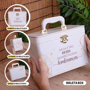 _ Maleta em MDF revestida com material sintético, com alça também revestida e fechamento em metal; _ Acompanha 6 álbuns com capa almofadada em material sintético com 50 folhas plásticas, comportando 100 fotos 10x15 cada álbum; _ Capacidade total de 600 fotos 10x15 na Box; _ Plásticos já inclusos rebitados no álbum com pinos metálicos (não é possível inserir mais folhas).