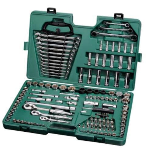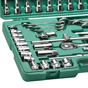 3 Chaves catracada 8x10 ; 12x13 ; 17x19 mm . 6 soquetes longos com encaixe de 1/4' medidas: 10 ; 11 ; 12 ; 13 ; 14 ; 15 mm . 6 soquetes longos com encaixe de 3/8' medidas: 4 ; 5 ; 6 ; 7 ; 8 ; 9 mm . 12 Chave combinada medidas: 8 ; 9 ; 10 ; 11 ; 12 ; 13 ; 14 ; 15 ;16 ; 17 ; 18 ; 19 mm . 6 soquetes longos com encaixe de 1/2' medidas: 10 ; 12 ; 13 ; 14 ; 17 ; 19 mm 7 soquetes estriado com encaixe de 1/2' medidas: 20 ; 21 ; 22 ; 24 ; 27 ; 30 ; 32 mm 4 soquetes de impacto com encaixe de 1/2' medidas:23 ; 21 ; 19 ; 17 mm Dentre outras.... Marca: Sata Ferramentas