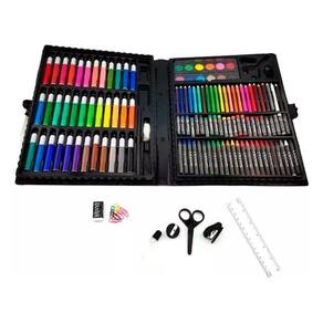 Maleta de pintura infantil para estimular a criatividade e imaginação. Esse conjunto contém: 12 aquarelas, 1 pincel, 24 gizes de cera, 24 bastões de cera, 24 lápis de cor, 36 canetinhas, 1 apontador, 1 cola, 1 borracha, 23 clips, 1 tesoura, 1 régua e 1 grampeador