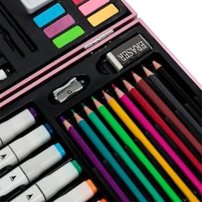 Este conjunto completo inclui ferramentas de desenho essenciais, como lápis de cor, apontador de lápis e borracha. Compacto e conveniente.