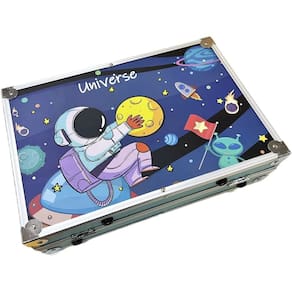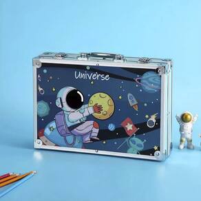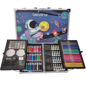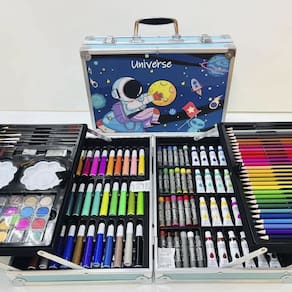Este conjunto completo inclui ferramentas de desenho essenciais, como lápis de cor, apontador de lápis e borracha, canetinhas, giz de cera, tinta guache, e tinta aquarela, além dos pincéis e suporte, tudo isso em uma só maleta. Compacta e conveniente.