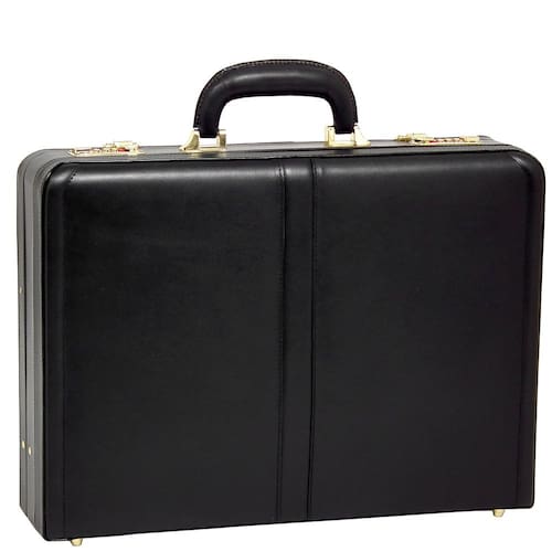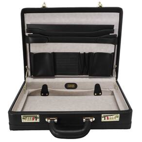 - O interior inclui uma seção organizadora que comporta cartões de visita, celulares, canetas, blocos de notas e calculadoras.