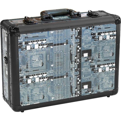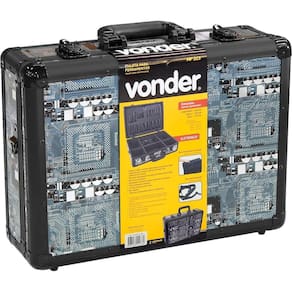Possui estrutura rígida revestida externamente em alumínio, com estampa imitando placa eletrônica, além de cantos em aço e laterais reforçadas com cantoneira de alumínio, ambos na cor preta, conferindo maior durabilidade. Revestida internamente com material sintético macio (EVA), com 5 divisões internas removíveis e ajustáveis que adequam-se a diferentes tamanhos e formatos de ferramentas. Acompanha porta-ferramentas removível e alça auxiliar em nylon. Conta ainda com 2 fechos metálicos com chave e fivelas e dobradiças em aço.