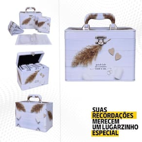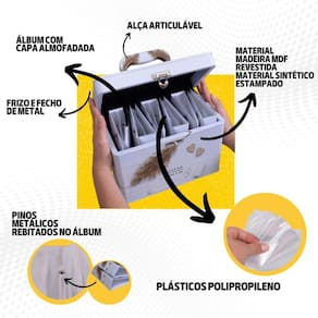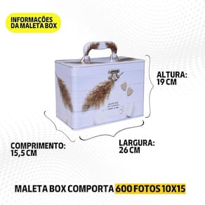 CARACTERÍSTICAS: _ Maleta em MDF revestida com material sintético, com alça também revestida e fechamento em metal; _ Acompanha 6 álbuns com capa almofadada em material sintético com 50 folhas plásticas, comportando 100 fotos 10x15 cada álbum; _ Capacidade total de 600 fotos 10x15 na Box; _ Plásticos já inclusos rebitados no álbum com pinos metálicos (não é possível inserir mais folhas).