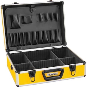 Conteúdo da embalagem1 Maleta para ferramentasAplicações e dicas de usoIndicada para acondicionamento de ferramentas em geralDestaques e diferenciaisPossui estrutura rígida revestida externamente em alumínio na cor amarela, além de cantos plásticos e laterais reforçadas com cantoneira de alumínio, conferindo maior durabilidade. Revestida internamente com material sintético macio EVA , com 5 divisões internas removíveis e ajustáveis que adequam-se a diferentes tamanhos e formatos de ferramentas. Acompanha porta-ferramentas removível e alça auxiliar em nylon. Conta ainda com 2 fechos metálicos com chave e fivelas e dobradiças em aço. DETALHES TÉCNICOS Comprimento da maleta para ferramentas: 455,0 mm Largura da maleta para ferramentas: 330,0 mm Altura da maleta para ferramentas: 152,0 mm Material da maleta para ferramentas: Estrutura rígida, revestida externamente em alumínio Cor da maleta para ferramentas: Amarelo Capacidade máxima da maleta para ferramentas: 10,0 kg Marca: Não Informado