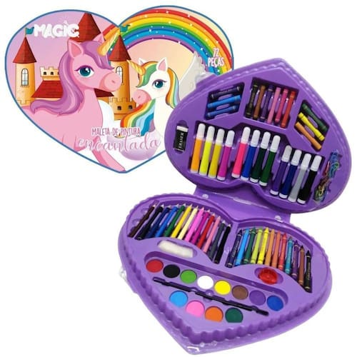 Divirta-se pintando e descobrindo novos materiais com a maleta de pintura Unicornio da Escolar Magic. Contem 72 pecas para que voce pinte e use sua imaginacao ate cansar Aprenda brincando Contem: 12 canetinhas coloridas12 gizes de cera8 clips coloridos12 tintas aquarela1 pincel1 cola1 borracha1 apontador12 lapis de cores12 gizes pasteis Homologação Inmetro: 034151403584 Ean: 7899550901485