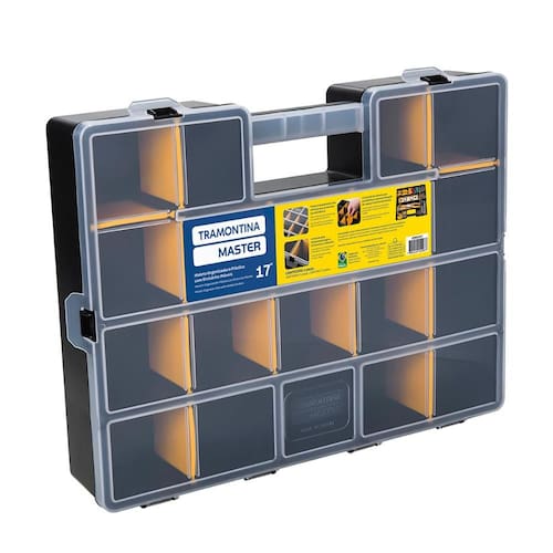 Aperfeiçoe a organização de pequenos itens com a Maleta Plástica Organizadora 17" Master - Tramontina 43805017, a escolha ideal para quem busca ordem total e flexibilidade com padrão de excelência. Indicada para profissionais, hobbystas e para oficinas ou residências, esta caixa organizadora facilita a localização e o transporte de acessórios. Sua função primordial é armazenar e separar peças. A estrutura com divisórias móveis garante personalização eficiente do espaço, essencial para manter parafusos, componentes e artigos de pesca sempre acessíveis.