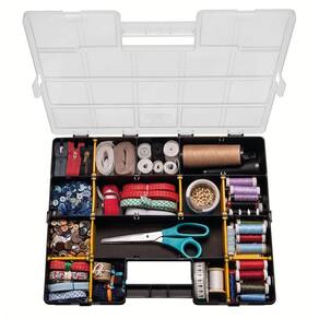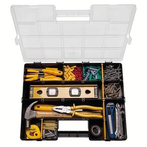 A Maleta Plástica Organizadora 17 Polegadas Tramontina com Divisórias Móveis vai deixar suas ferramentas mais organizadas e fáceis de transportar! Com divisórias que facilitam o manuseio, ela é produzida em plástico. Além de ferramentas, ela é ótima para guardar artigos de pesca, entre outros acessórios. Um produto funcional que serve para deixar seus objetos em ordem. Orientações Corpo e divisórias móveis injetadas em polímero de alta resistência.19 compartimentos internos.14 divisórias móveis que possibilitam a personalização do espaço interno da maleta.Tampa transparente com reforços que aumentam sua resistência.4 Travas para fechamento seguro (2 frontais e 2 laterais).Projetada para fácil personalização e portabilidade.Possibilita encaixar martelo de tamanho pequeno e médio. Características Gerais EAN13 7891114152937 DUN14 17891114152934 NCM 3923.10.90 Peso Líquido 1,2000 kg. Peso Bruto 1,4700 kg. Metragem 0,014537 m³. Dimensões Embalagem (Compr. X Larg. X Alt.) 455x 355x 90 mm. Dimensões Produto (Compr. X Larg. X Alt.) 432x 330x 82 mm. Observações Sempre utilizar óculos de segurança para proteger os olhos. Utilizar luvas para proteger as mãos. Não sobrecarregar as caixas de ferramentas com peso excessivo. Sempre manter as caixas trancadas durante sua movimentação ou transporte. Não apoiar peças sobre as caixas para realizar qualquer trabalho. As caixas são submetidas a testes de aplicação prática para garantir sua resistência durante o uso.