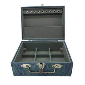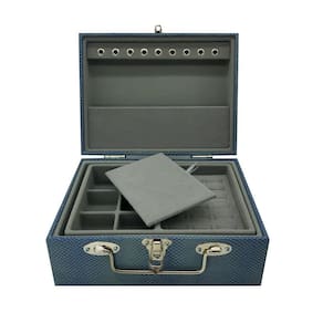 Maleta Porta Joias Azul Jeans Pequena Dupla Maleta Porta-Joias Azul Jeans Pequena-Dupla, material externo em material sintético e material interno e das almofadas em veludo cinza. Feixo em metal. Ficha técnica - Quantidade de compartimentos: N/A - Material do exterior: Madeira - Com espelho: Não - Material do interior: Couro - Quantidade de gavetas: N/A - Fonte do produto: N/A - Cor principal: Azul - Com fechadura: Não Marca: Eliane Jóias Ean: 7890000065528