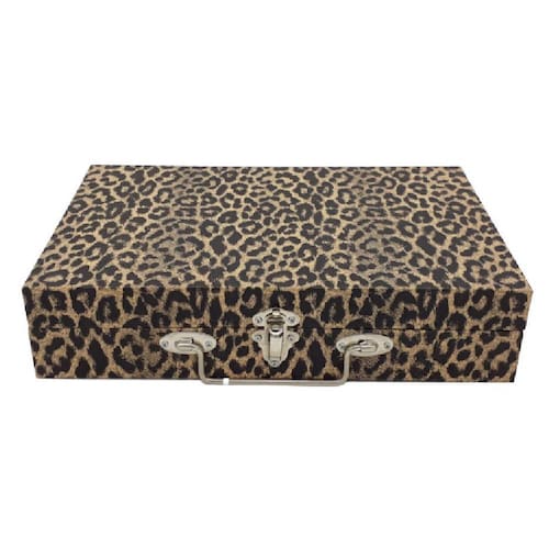 ELIANE JÓIAS e ÓPTICA ELIANE, sempre o melhor em jóias, acessórios, relógios, óculos de sol e grau. Ótima maleta para guardar jóias. -maleta porta-jóias média simples em material sintético Estampa de Onça, com interior aveludado na cor marrom -8 compartimentos quadriculados e acompanha a tampa removível -12 ilhós para correntes e pulseiras -20 compartimentos para anéis -alça e fecho em metal, super resistente -não acompanha espelho -dimensão 28,5 cm x 18 cm x 6,5 cm. Marca: Eliane Jóias Ean: 2960000798445