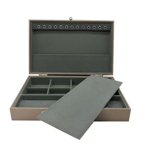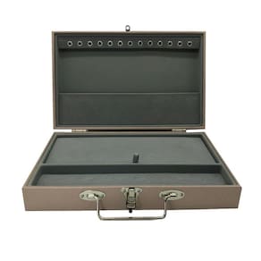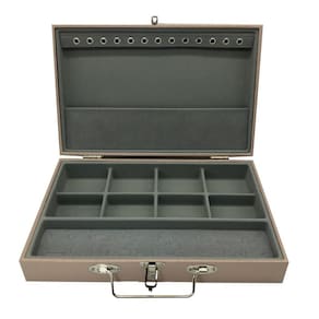 -bandeja com 12 compartimentos acompanha tampa de bandeja . -compartimento para 26 anéis. -alça e fecho em metal super resistente que comporta um cadeado pequeno cadeado não acompanha o produto Não acompanha espelho. -dimensões:35x24x6.5 cm.